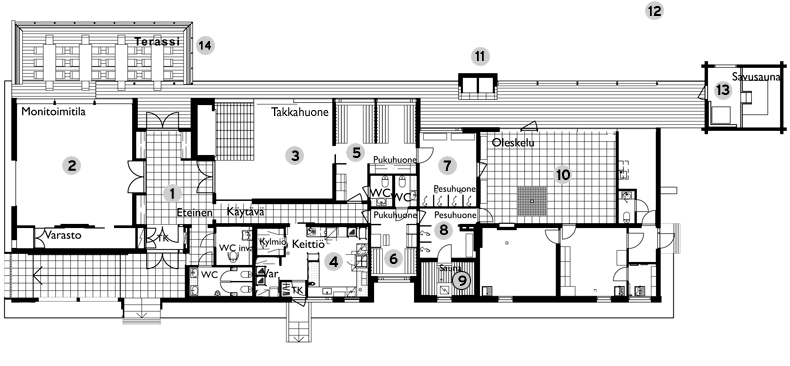 Tutustu saunan eri tiloihin ja sen tarjoamiin varusteisiin klikkaamalla numeroita.